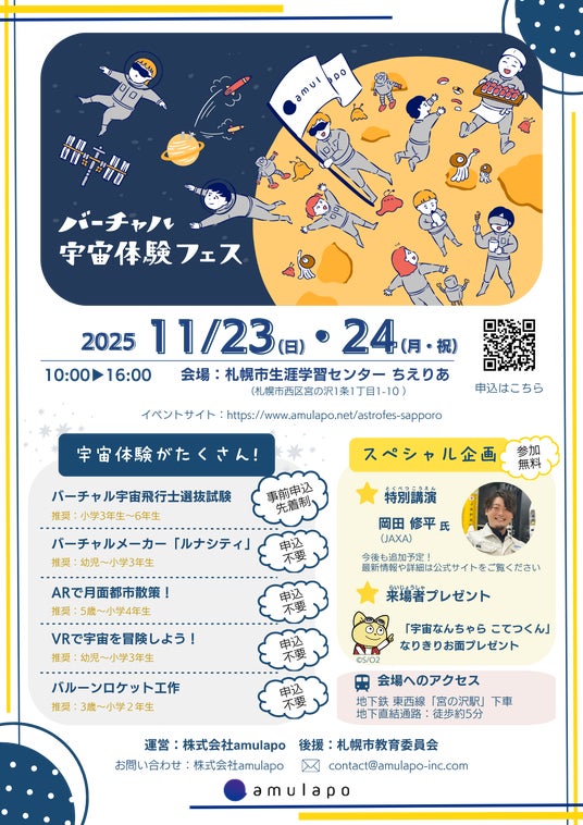 株式会社amulapo(アミュラポ、本社:東京都新宿区、代表取締役:田中克明)は、11月23日(日)・24日(月・祝)に「バーチャル宇宙体験フェス」を札幌市生涯学習センター ちえりあにて開催します。ぜひ、会場までお越しください。