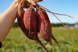 【楢葉町のサツマイモ】楢葉町は、「スイーツ甲子園 ふくしまチャレンジカップ」の決勝大会が開催されるサッカー日本代表のナショナルトレーニングセンター「Jヴィレッジ」の所在地です。サッカーの聖地であるとともに、復興のシンボルとしてさまざまなイベントが行われ、年間を通じて多くの人が訪れています。楢葉町の基幹産業である農業の復興に向けて今、新たな特産品として栽培が広がっているのがサツマイモです。2017年に試験栽培を開始し、和・洋菓子の製造販売を手掛ける白ハト食品工業が楢葉町に設立した「福島しろはとファーム」などが本格的な栽培に乗り出し、一大産地を目指しています。新ブランドとして栽培されている「ふくしまゴールド」は、甘味と食感に優れたスイーツにピッタリの品種です。