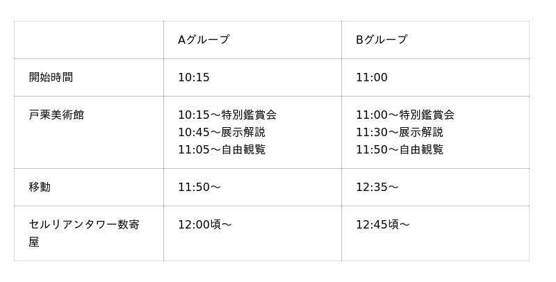 開始時間の異なるA、Bの2グループで行います。開始時間までに戸栗美術館にて受付をお済ませください。