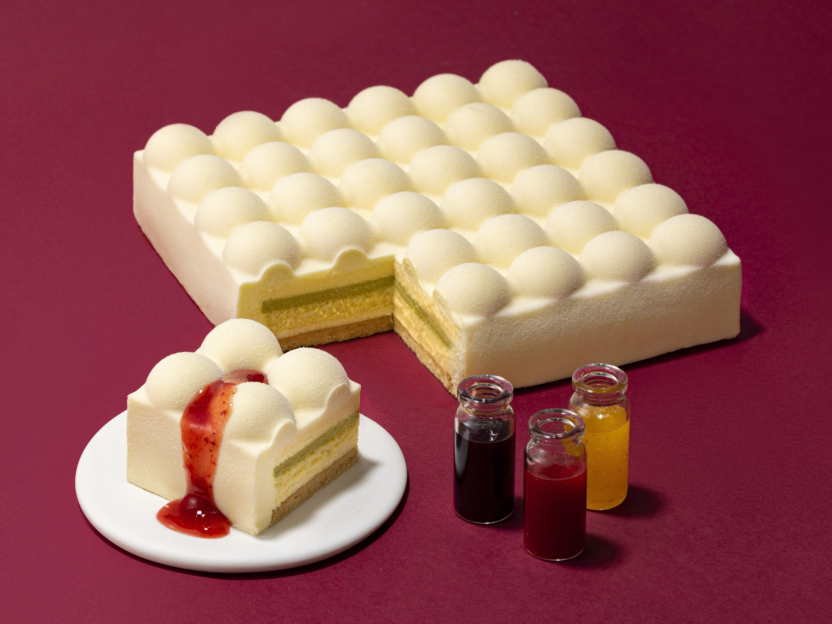 ポコポコとしたユニークな形状が目を引く、特別感あふれる一台。サブレを土台にバニラムース、スポンジ、ピスタチオクリーム、ホワイトチョコムースを重ね、なめらかな口どけに仕上げました。別添の3種フルーツソース(苺・オレンジ・カシス)を好みに合わせてかければ、彩りと味わいの変化が楽しめます。普段はケーキを販売しない東京駅限定のブランドが、クリスマスの期間だけ限定でお届けする希少な一台。プレミアムなクリスマス体験を彩ります。