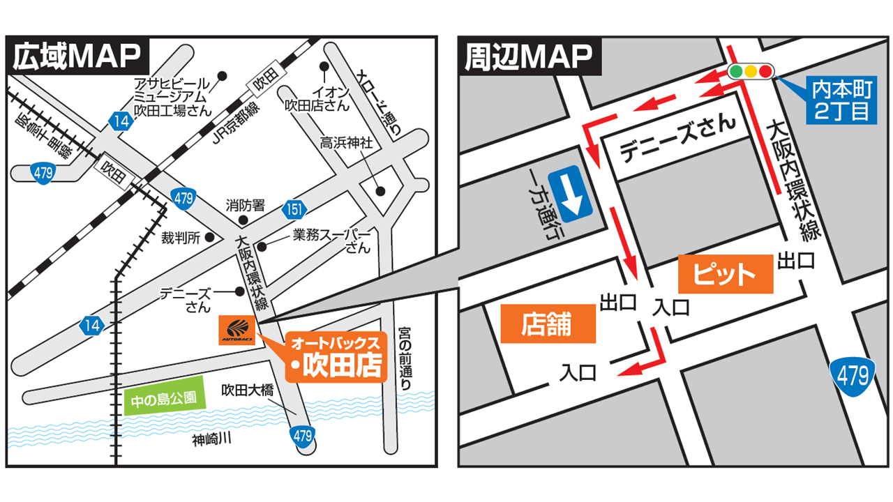 店舗は、阪急吹田駅の南東約0.8Km、国道479号線沿いに位置します。タイヤ、オイル、バッテリーをはじめとしたカー用品に加え、カーライフの楽しさを提案する幅広い商品や、整備・メンテナンス、車買取・販売などのサービスを展開いたします。自動車整備に関する知識と技術、提案力を備え、安心してクルマのメンテナンスをお任せいただける店舗として地域のお客様を全力でサポートいたします。