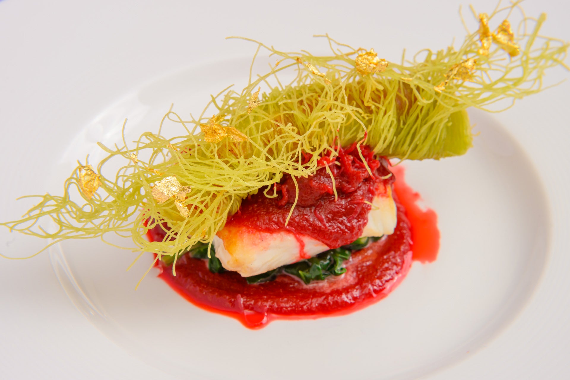 メインの魚料理には、その時期最も上質な白身魚を厳選してポワレし、オリジナルブレンドのスパイスで仕上げたビーツのソースを合わせました。オマール海老は、クリスマスツリーを模した緑色のカダイフ(その繊細さから「天使の髪」とも呼ばれます)で包み、中温の油でパリパリっと色鮮やかに揚げています。