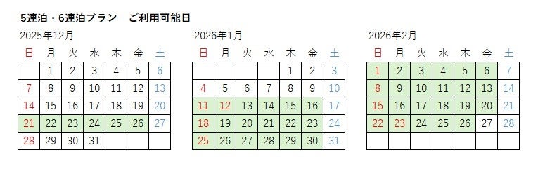6連泊プラン…土曜日~木曜日・日曜日~金曜日・月曜日~土曜日の宿泊