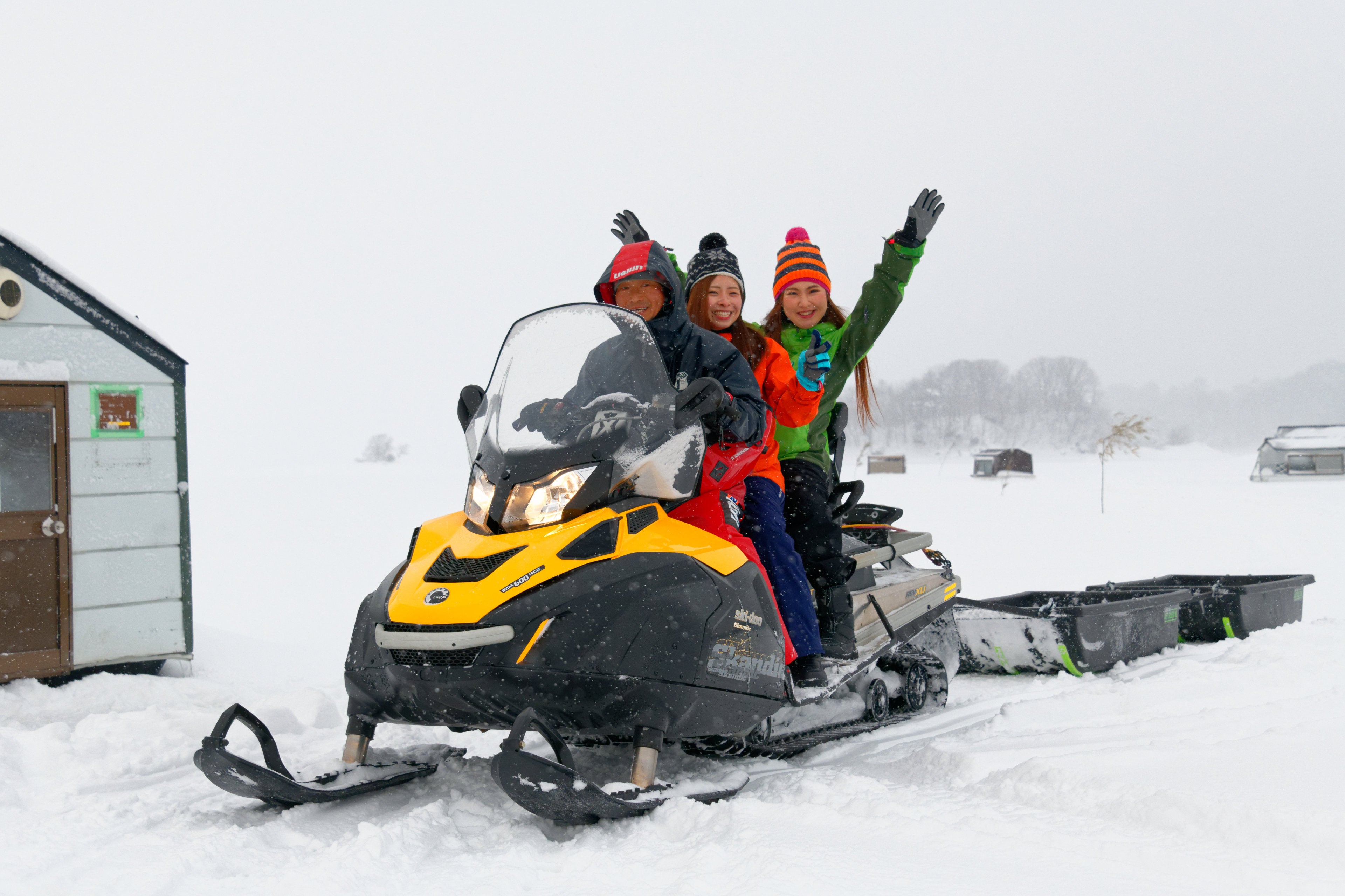 桧原湖凍結後はスノーモービルで移動(わかさぎ釣り体験)