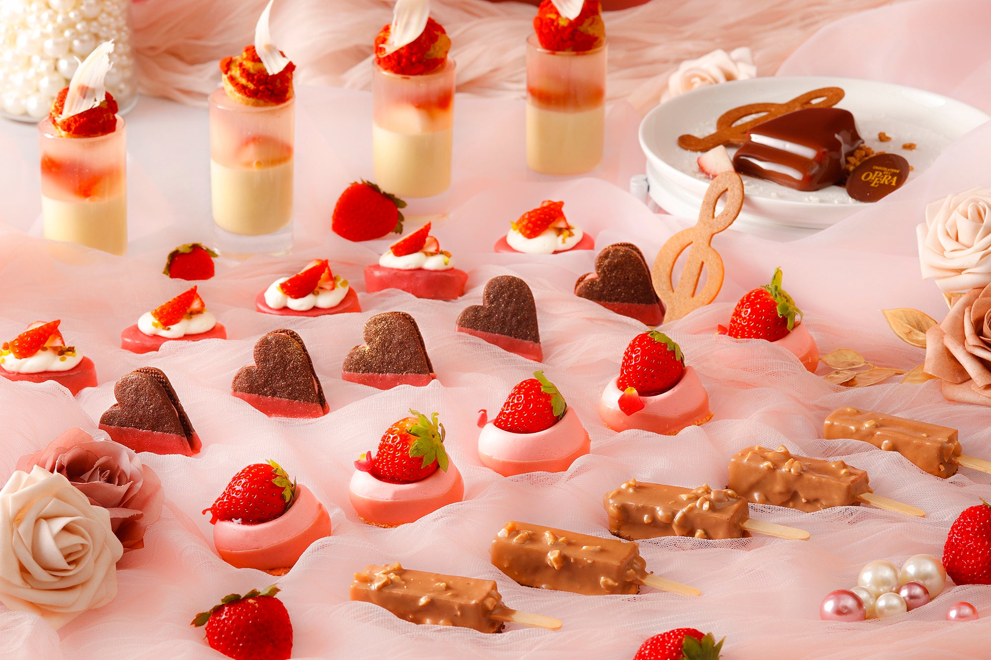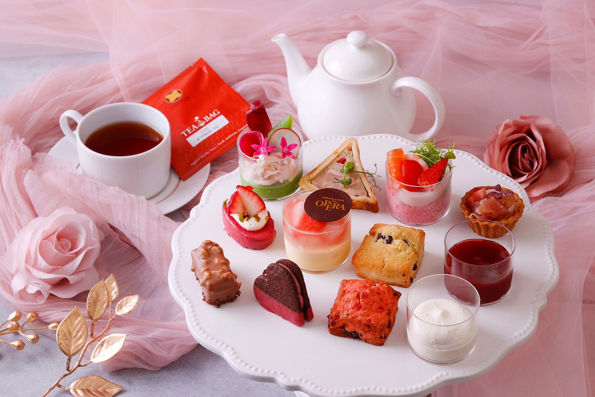 プティ・ガトーには、ホワイトチョコレートムースといちごを閉じ込めたライチジュレのヴェリーヌ「プレリュード・ブラン」、ローズが香るいちごのレアチーズケーキ「ローズ・アダージョ」、ハート型のショコラサブレサンド「カルメン」、いちごのフィナンシェをチョコレートにディップし、宝石のように仕上げた「ビジュー・ド・オペラ」、指揮棒をイメージした香ばしいヘーゼルナッツを楽しめるジャンドゥーヤバー「バトン・デュ・マエストロ」の5種をラインナップ。