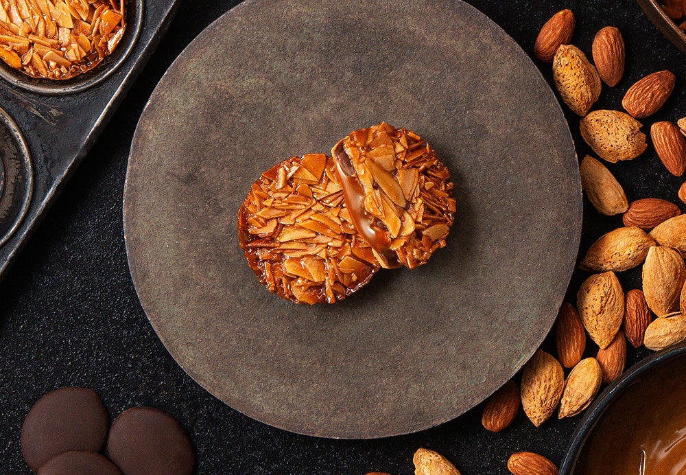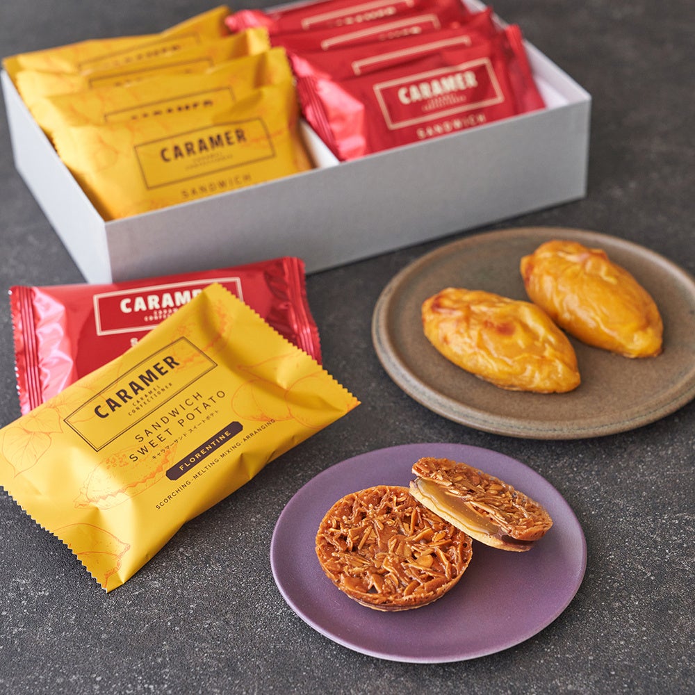 華やかな甘みのアーモンドフロランタンとバターサブレでミルクチョコレートと、さつま芋、バター、生クリームを合わせて炊き上げたスイートポテトキャラメルをサンドしました。