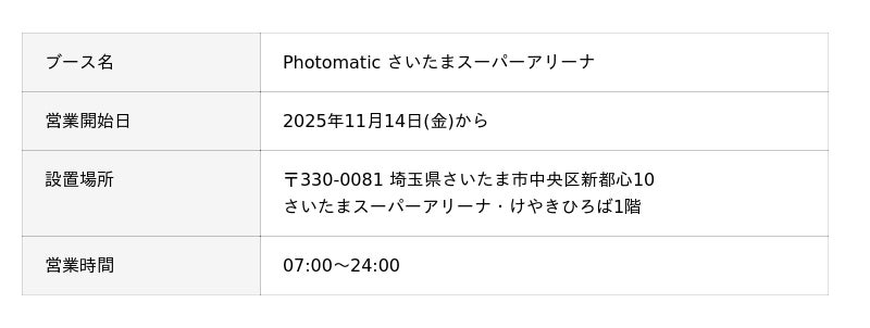 キタムラ・ホールディングス グループのピックハイブ株式会社(本社:東京都新宿区、代表取締役社長 兼 COO:大迫 由典)が運営するセルフフォトブランド「Photomatic(読み:フォトマティック)」は、2025年11月14日(金)から埼玉県で屈指の複合施設であるさいたまスーパーアリーナ・けやきひろばに埼玉エリア初となる常設フォトブースをオープンいたしました。