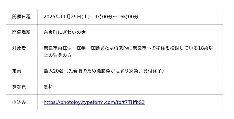マッチングアプリ専門の撮影サービス「Photojoy」は、奈良市および恋活・婚活マッチングアプリ「Pairs(ペアーズ)」と連携し、市民の恋活・婚活支援を目的とした「プロフィール写真撮影会」を開催いたします。