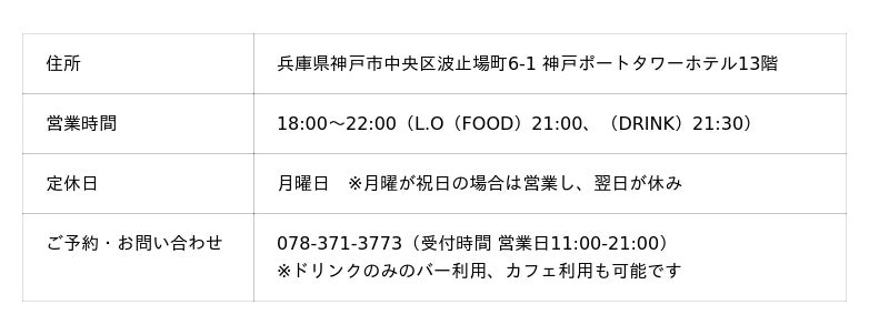 まるで“大人の隠れ家”のような落ち着いた雰囲気は、アニバーサリーなどの特別な日、ご夫婦・カップルでのロマンティックなディナー、女子会やカジュアルなお食事など、さまざまなシーンに寄り添います。美しい神戸の夜景を背景に、心に残る上質なひとときをお過ごしください。
