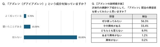 アズレンの認知度は14.2%と低いものの、成分特性の説明後には89.7%が「使ってみたい」と回答しました。“知られていないが、知ると魅力が伝わる成分”として、潜在的な需要の高さが浮き彫りになっています。