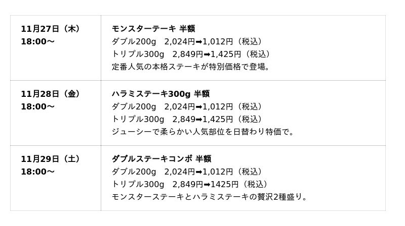 ブラックフライデーに合わせたこの3日間、人気ステーキ3種類を“日替わり半額”で提供。