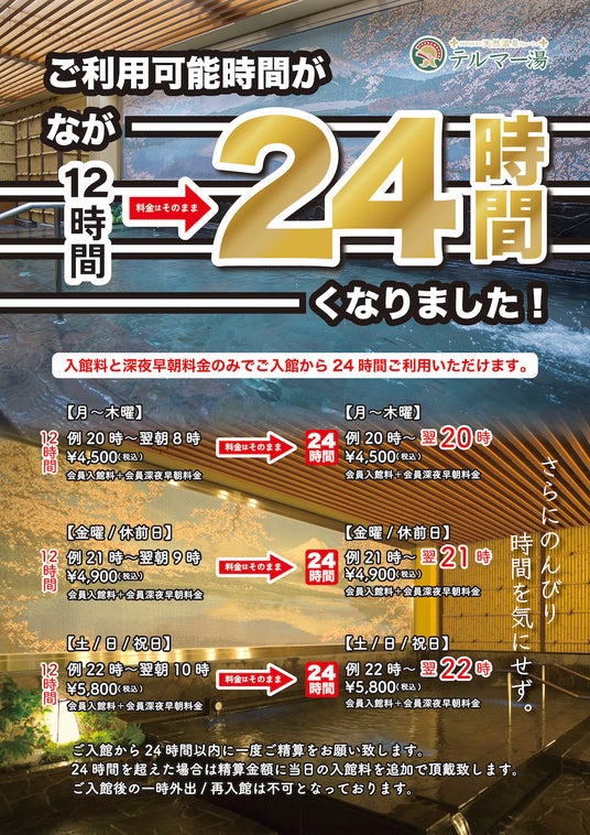 テルマー湯新宿店ではこれまで12時間だった最大利用時間を10月1日(水)より最大24時間に延長したことによって朝得割引と合わせて月曜~木曜日は2,900円(一般料金)の入館料金のみで朝6時から深夜24時まで最大18時間利用可能になります。