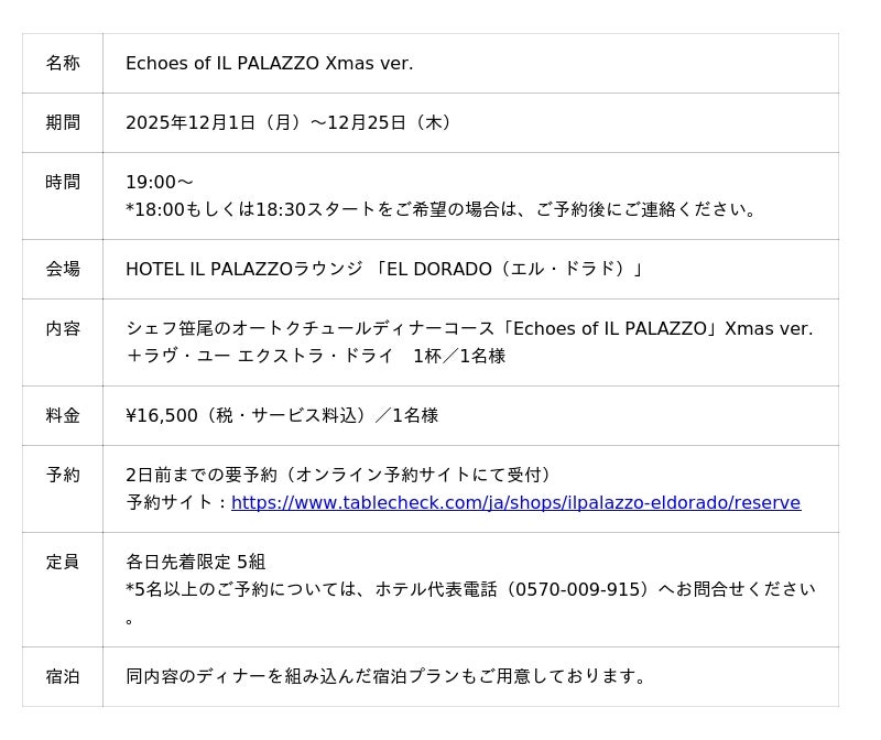 HOTEL IL PALAZZOの壮麗なデザイン空間で、特別なクリスマスディナーを。