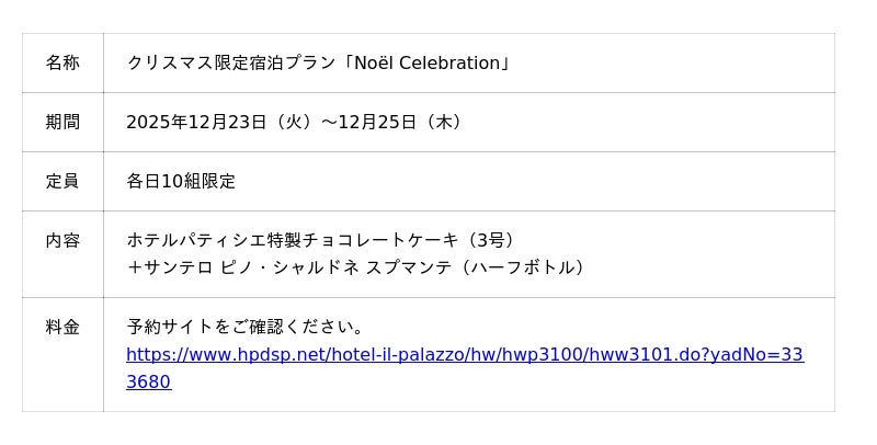 日本初のデザインホテル「HOTEL IL PALAZZO(ホテル イル・パラッツォ)」(所在地:福岡市中央区春吉3-13-1)では、 2025年12月1日(月)から12月25日(木)まで、ホテルならではの非日常空間で、大切な人との特別な時間を過ごせるクリスマス限定プランをご用意いたします。