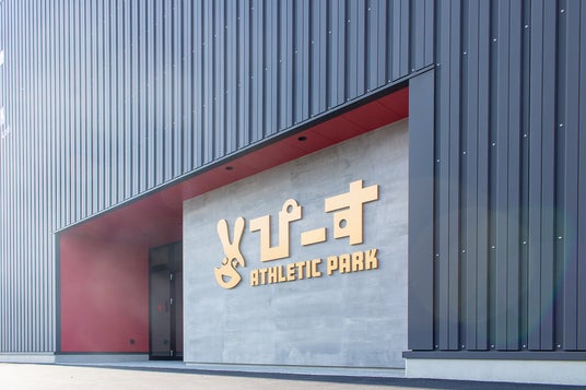 赤のアクセントとコンクリート壁に映えるゴールドロゴが特徴的なエントランス。来場者をワクワクさせる「アスレチック施設 ぴーす」メイン入口です。