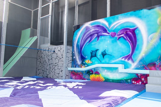 色鮮やかな海の世界が広がるエリア。イルカのアートを背景に写真を撮ったり、ふわふわのエアバッグへ思いきりジャンプできます。