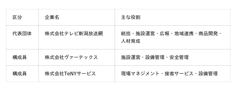 本コンソーシアムは、TeNYを代表団体とし、株式会社ヴァーテックス(新潟市江南区、代表取締役:帆苅学)、株式会社TeNYサービス(新潟市中央区、代表取締役社長:上原小百合) の3社で構成される共同事業体です。各社が持つ専門性とネットワークを結集し、「地域の元気を創造する舞台」としての道の駅朝日のリニューアル(2027年秋予定)と持続的な運営を目指します。TeNYは、メディアとしての発信力と地域社会におけるハブ機能を活かし、村上市の地域経済の成長と、誇りと愛着を生み出すマネジメントに取り組んでまいります。