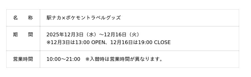 オープニングを飾るコンテンツは、12月3日(水)から12月16日(火)まで、大人気の「ポケモントラベルグッズ」が登場します。