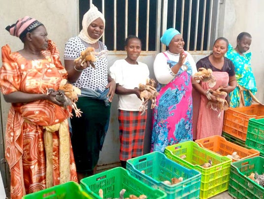 HFW活動地のひとつ、ウガンダの市場で育てたニワトリを売る女性グループ