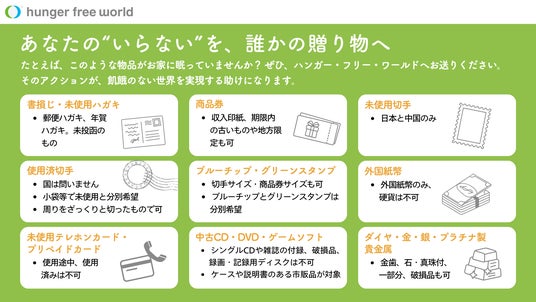 お送りいただく物品は、ハガキや切手のほか、幅広くご寄付を受け付けています。 “いらないもの” も、他の誰かへの贈り物になるかもしれません。