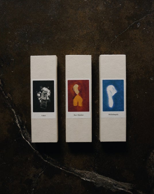 燭台「コア」(蓋はお香立てとして使える) 左から「運慶」「ラヴィ・シャンカル」「ミケランジェロ」各 ¥9,570(税込)