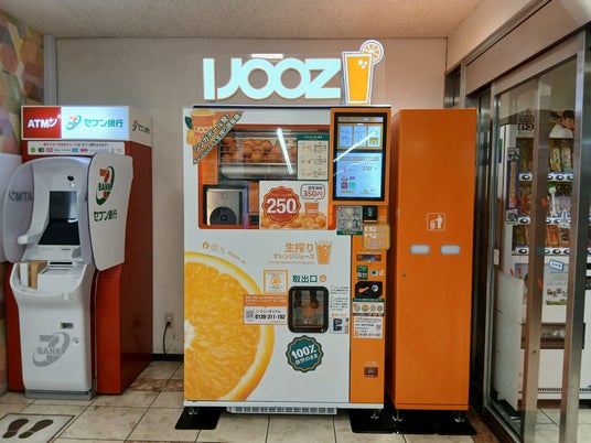 豊橋駅ビル「カルミア」にて稼働する生搾りオレンジジュース自販機IJOOZ