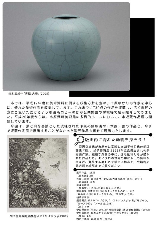 今回の収蔵作品展「Monochrome ―市原市収蔵作品展―」では、その中から、黒と白を基調にした洗練された印象の銅版画、日本画、書など17点に加え、これまで展示機会のなかった陶芸作品1点を新たに紹介します。