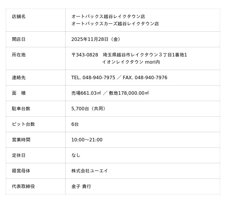 株式会社オートバックスセブン(代表取締役 社長:堀井勇吾)と加盟店契約を結んでいる株式会社ユーエイ(代表取締役:金子貴行)は、2025年11月28日(金)に「オートバックス越谷レイクタウン店」および「オートバックスカーズ越谷レイクタウン店」を新規オープンいたします。