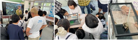 子どもたちは教授が実際に川から採取してきたカニを観察しました。その中には絶滅が危惧されている種もいて、生息環境の変化を目の当たりにする貴重な機会となりました。