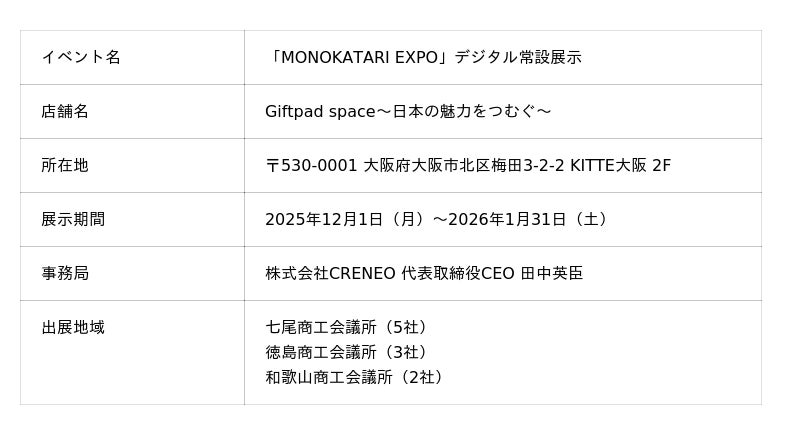 株式会社ギフトパッド(本社:大阪市、代表取締役:園田 幸央、以下、ギフトパッド)は、運営する次世代アンテナショップ『Giftpad space~日本の魅力をつむぐ~』(KITTE大阪2F)にて、日本全国の工芸・ものづくりの魅力をデジタルで体感できる「MONOKATARI EXPO」デジタル常設展示を、2025年12月1日(月)より2026年1月31日(土)までの2か月間、期間限定で開催いたします。