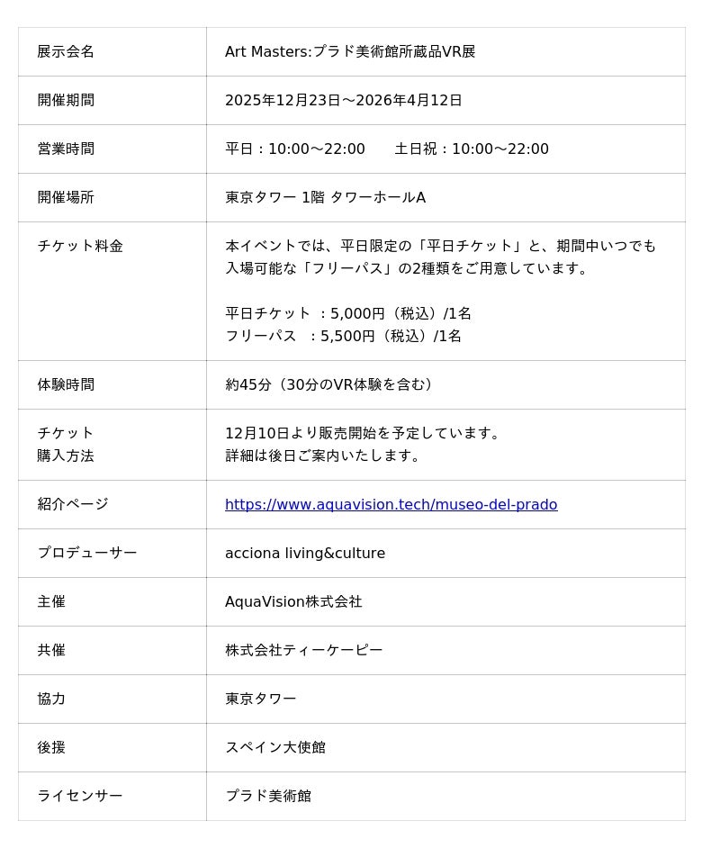 株式会社ティーケーピー(本社:東京都新宿区、代表取締役社長:河野 貴輝、以下TKP)は、2025年10月31日付でAquaVision株式会社(本社:東京都新宿区、代表取締役社長:付斯瑶(フシヨウ))、以下Aqua Vision)の株式を30%取得し、関連会社といたしました。併せて、同日に資本業務提携契約を締結しました。その第一弾プロジェクトとして、2025年12月23日より東京タワーにてプラド美術館のVRアート展「Art Masters:プラド美術館所蔵品VR展」を開催することが決定しましたのでお知らせいたします。