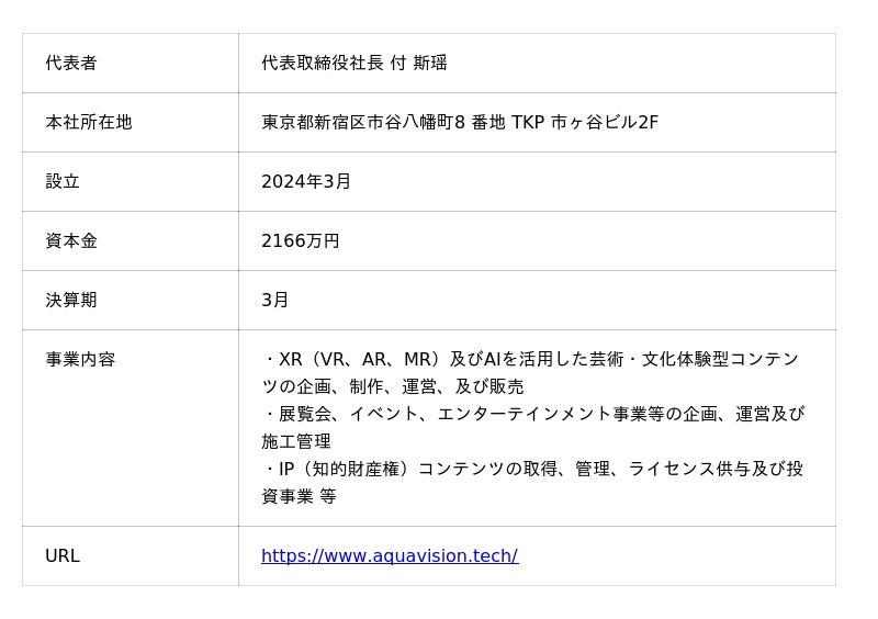 AquaVisionは、VRエンターテインメントの企画・制作を手がける企業です。展覧会やイベントの企画・運営に加え、IP(知的財産権)の取得・管理・ライセンス供与や投資事業も行っています。世界的な文化遺産をVR技術で再現し、没入型エンタメとして発信することで、都市のスキマ時間や空間に新たな文化体験を創出しています。