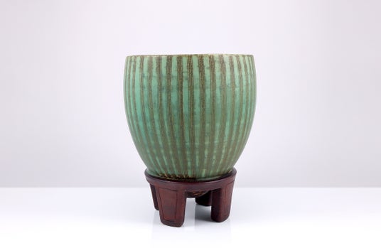 緑釉線文四足花器、Wilhelm Kåge(ヴィルヘルム・コーゲ) Sweden Gustavsberg(グスタフスベリ製陶所)、21.8×18.5cm、1955年 、炻器、出展ギャラリー:ギャラリー北欧器
