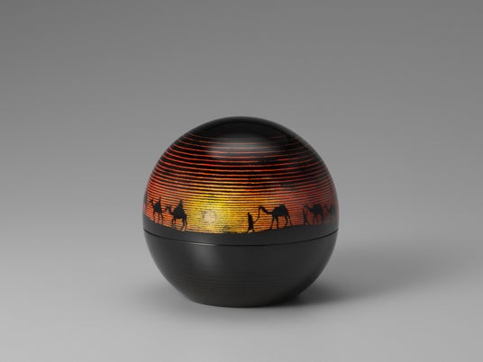北岡道代《乾漆蒟醬箱「サンセットキャラバン」》2024年、漆・麻布・顔料・錫粉、10.6×10.6×9.6 cm、(C) S&T PHOTO、出展ギャラリー:香川県漆芸研究所
