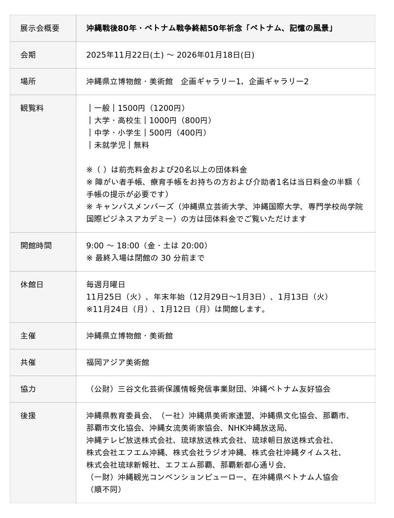 沖縄県立博物館・美術館(おきみゅー)では、沖縄戦後80年・ベトナム戦争終結50年祈念「ベトナム、記憶の風景」(主催:沖縄県立博物館・美術館)を開催いたします。