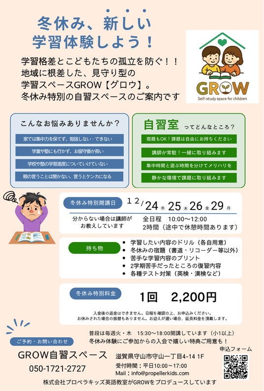 株式会社プロペラキッズ(滋賀県守山市)は、11月にオープンした見守り型自習スペース「GROW(グロウ)」にて自習スペース体験会を冬休みの2025年12月24・25・26・29日の4日間開催します。