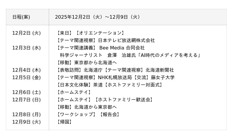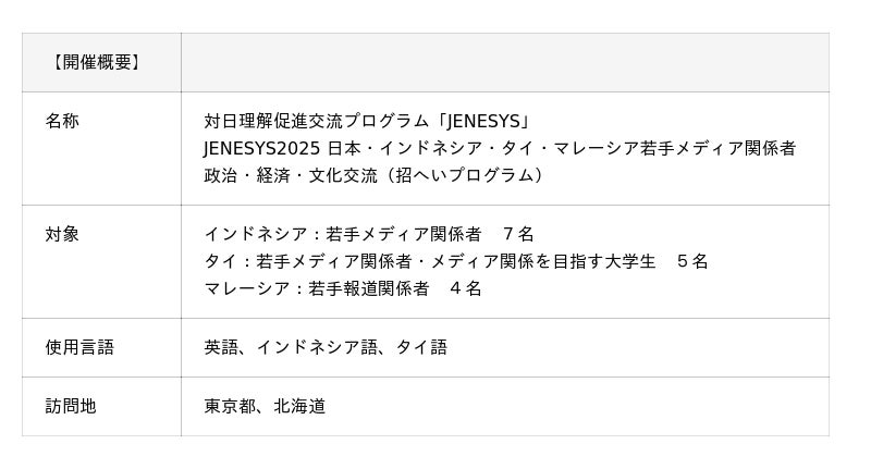 本プログラムは、インドネシア・タイ・マレーシアの若手メディア関係者が、日本の政治・経済・文化・外交政策を学び、専門家との交流や施設視察、文化体験を通じて、日本理解を深めます。将来の友好・協力ネットワーク構築を目指す国際交流事業です。