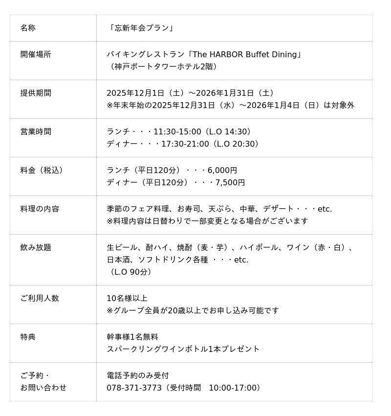株式会社アベストコーポレーション(代表取締役:松山 みさお)が運営する神戸ポートタワーホテル(支配人:薩摩 利幸、兵庫県神戸市中央区)は、バイキングレストラン「The HARBOR Buffet Dining(ザ・ハーバー ビュッフェダイニング)」にて、バイキングの食べ放題とアルコール含む飲み放題が120分間楽しめる「忘新年会プラン」を2025年12月1日(月)~2026年1月31日(土)の期間※、平日限定で提供いたします。