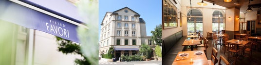 「BISTRO FAVORI 代官山」は、旧山手通り沿いにひときわ目立つ西洋風の建物と、ネイビーの日よけがアイキャッチのフレンチレストランです。店内は昔のフランスの邸宅を思わせるノスタルジックな作りで、まるで友人宅に招かれたかのような雰囲気です。ランチやディナーには、シェフのこだわりが詰まったフレンチ料理と、ワインをお楽しみいただけます。ぜひ、この機会にBISTRO FAVORI 代官山で