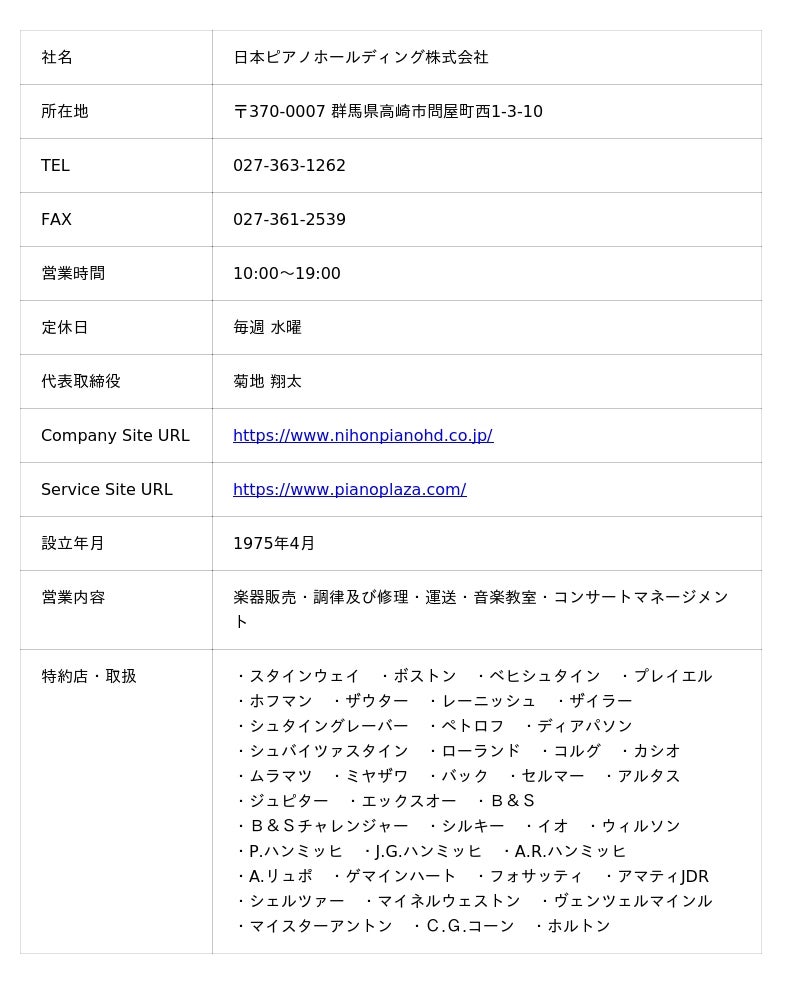日本ピアノホールディング株式会社日本ピアノホールディング株式会社は、群馬県高崎市に拠点を置き、総合楽器店「ピアノプラザ群馬」をはじめ、世界の名器を取扱う専門店「輸入ピアノ・ジャパン」、ピアノレンタルサービス「ピプレ」など、多様な事業を展開する楽器・音楽の総合企業です。