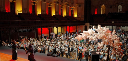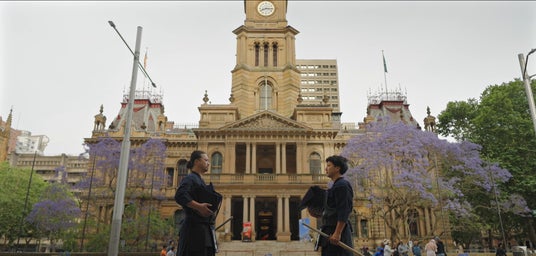 シドニー市庁舎の外観。ステージ前に集中する剣士
