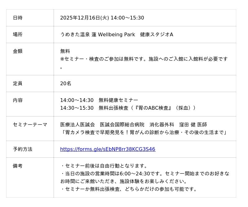 「うめきた温泉 蓮 Wellbeing Park」(総支配人:藤立 達哉、所在地:大阪市)は、2025年12月16日に、提携医療機関である医療法人医誠会(代表者:谷 幸治、本社:大阪市)の「医誠会国際総合病院」と共同で、第8回健康セミナーを開催することをお知らせします。