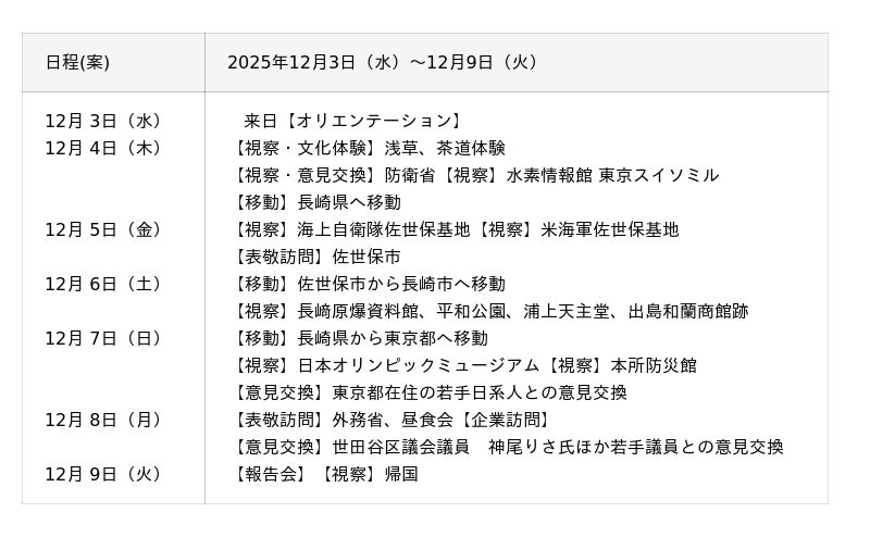 日本の政治、経済、女性活躍、エンターテイメントの分野について理解を深めるとともに、関係機関との人的交流や意見交換を通じてネットワークを強化し、今後、日系4世の若手リーダーとして日米関係のさらなる強化に貢献していただくことが期待されています。