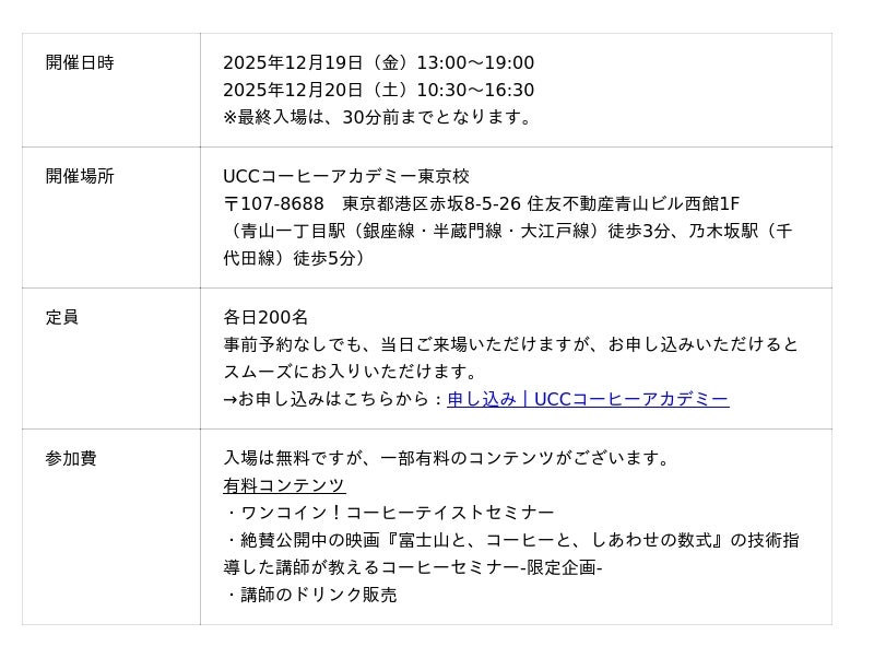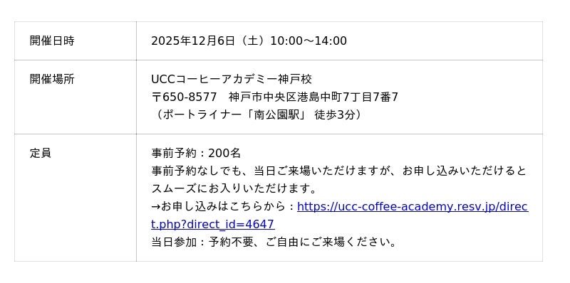 また、UCCコーヒーアカデミー神戸校でも、1年の感謝を込めて「UCC COFFEE ACADEMY 感謝祭2025 in KOBE」(一部有料)を12月6日(土)に開催します。