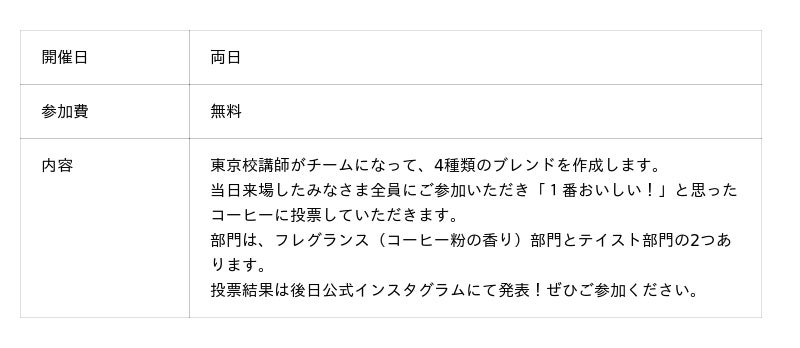 今回のイベントでは、UCCコーヒーアカデミー東京校の講師が提案したブレンドを来場された方が審査し投票する「講師のブレンドコンテスト」を、初めて実施します。東京校の各講師が二人一組となり、テーマも含め自由に様々な発想を持って、この日のためだけのオリジナルブレンドコーヒーを作ります。優勝したブレンドコーヒーについては、後日UCCコーヒーアカデミー公式Instagram(@ucc_coffee_academy)にて発表予定です。