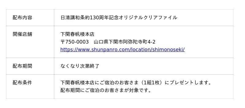 下関春帆楼本店(所在地:山口県下関市、総支配人:手柴 鋼太郎、以下「春帆楼本店」)は、日清講和条約締結130周年を記念した春帆楼本店オリジナルデザインのクリアファイルをプレゼントいたします。