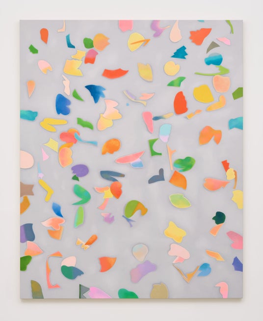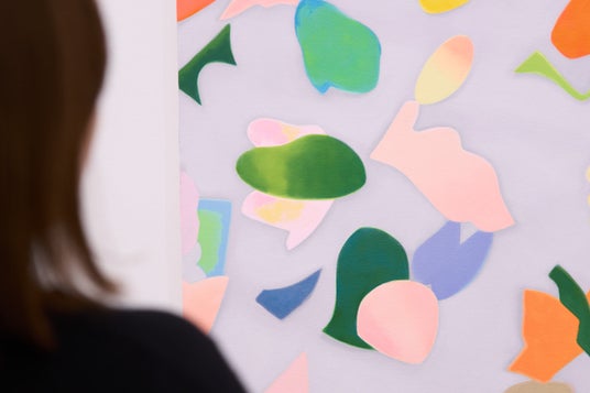 木津本がモチーフとするフェルトは、かつて彼女の母親が幼い彼女のために作ってくれたおもちゃの素材であり、何にでもなれる魔法の切れ端でした。木津本は、そのフェルトをランダムに切り出し、彩色を施し、それを床に放り投げ、そこに生まれたかたちの重なり、色の交わりを、キャンバスへと拾い上げていきます。