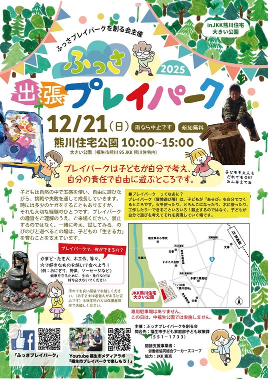 JKK東京(東京都住宅供給公社:東京都渋谷区、理事長:浜佳葉子、以下「JKK」)は、福生市のJKK住宅※「熊川住宅」内の公園で、子どもたちが自由に遊びを創造できる屋外遊び場「プレイパーク」を令和7年12月21日(日曜日)に初開催します。