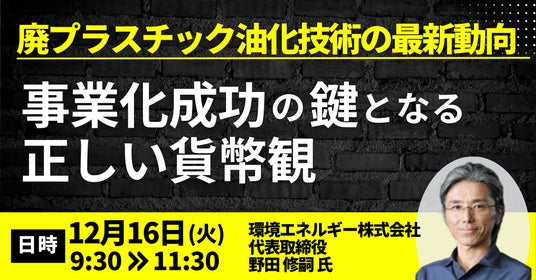 JPI(日本計画研究所)は、環境エネルギー株式会社 代表取締役 野田 修嗣 氏を招聘し、廃プラスチック油化技術の最新動向と事業化成功の鍵となる正しい貨幣観について詳説いただくセミナーを開催します。