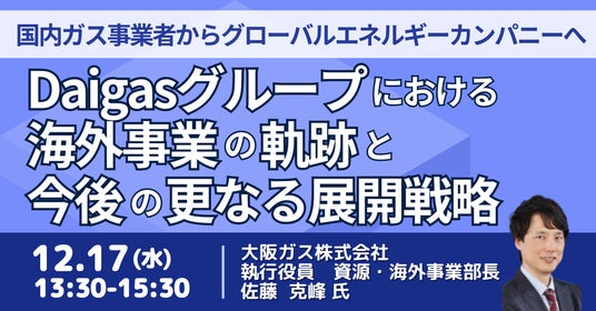 JPI(日本計画研究所)は、大阪ガス株式会社 執行役員 資源・海外事業部長 佐藤 克峰 氏を招聘し、Daigasグループにおける海外事業の軌跡と今後の更なる展開戦略について詳説いただくセミナーを開催します。